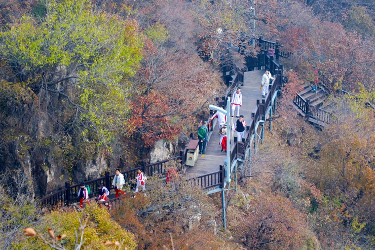 10点整,队伍全部抵达狼牙山。到达奇峰林立,峥嵘险峻的狼牙山,在狼牙山红色教育基地广场,站在鲜红的党旗和五勇士的雕像前,大家肃然起敬,并合影留念。
