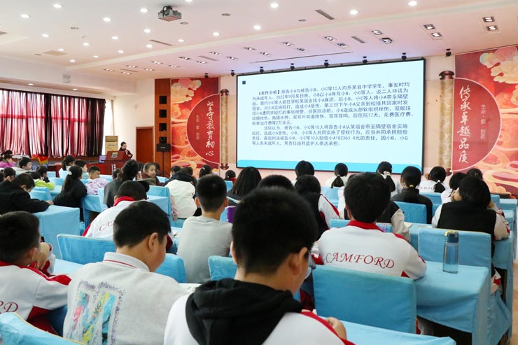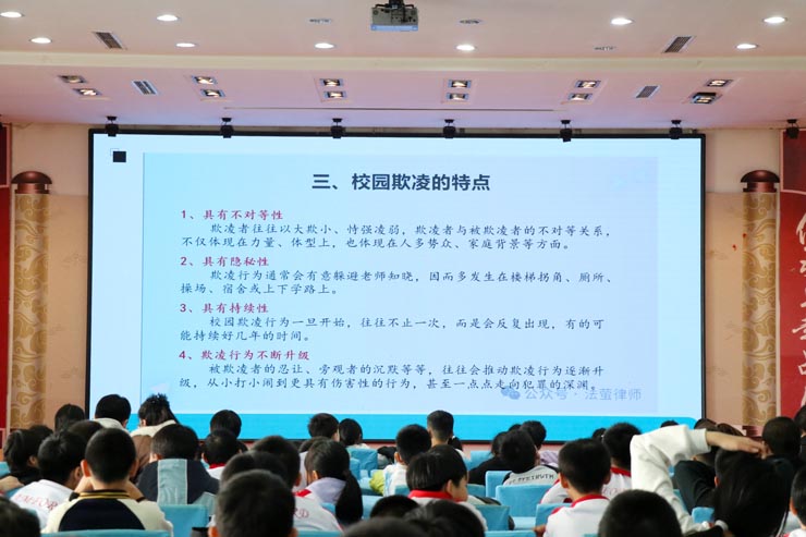 赵律师首先概括了习近平总书记法治教育思想,然后以“什么是校园欺凌”为切入点,深入浅出地讲解了校园欺凌类型、特点、如何应对及惩戒,让同学们深刻认识到校园欺凌的危害,引导同学们学会识别欺凌行为,提高自我保护意识。