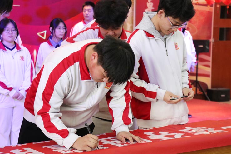 全体初三学子在鲜红的誓言条幅上郑重签下自己的名字。一笔一画,是承诺,是信念,更是对未来的无限期许。