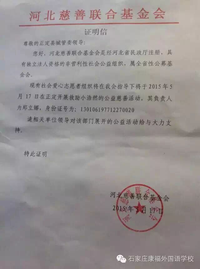 康福爱心志愿者团队将于5月17日(周日)上午九点在正定子龙广场举行“大爱有我,公益募捐‘拥抱小浩然’”慈善活动,募捐骨髓移植所需善款。